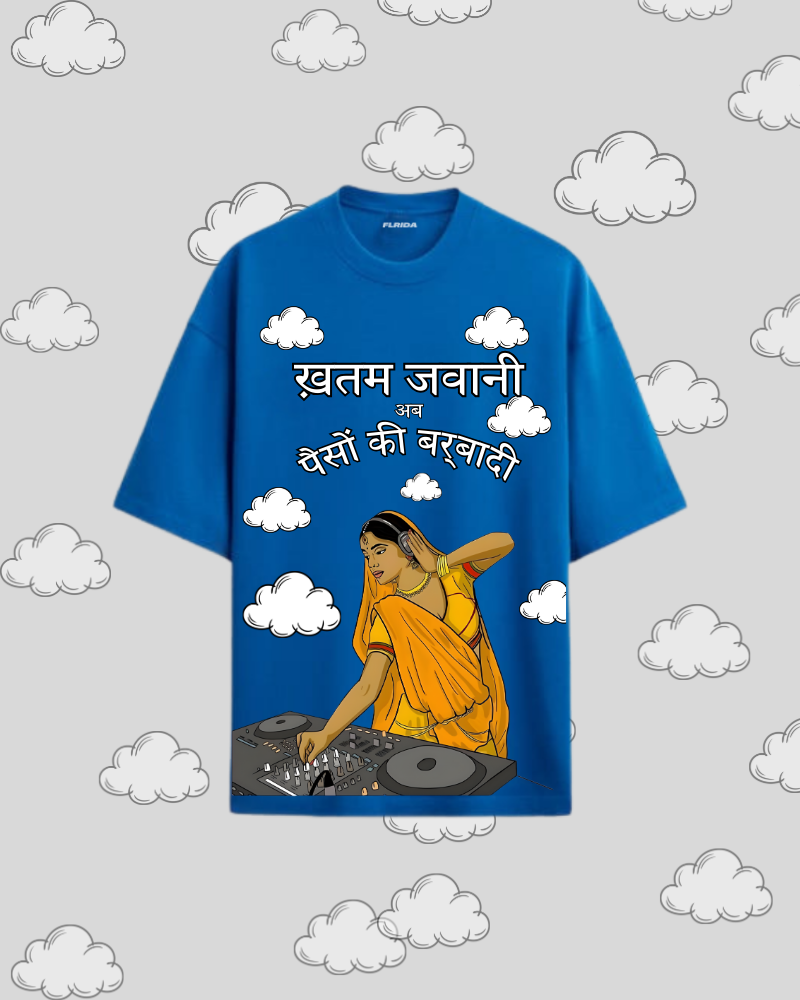A tee made for those who’ve grown past flexing youth and stepped into chasing the bag. This design flips nostalgia into hustle — clouds floating overhead, a DJ setup below, and a desi queen controlling the vibe. It’s humorous, self-aware, and painfully relatable.