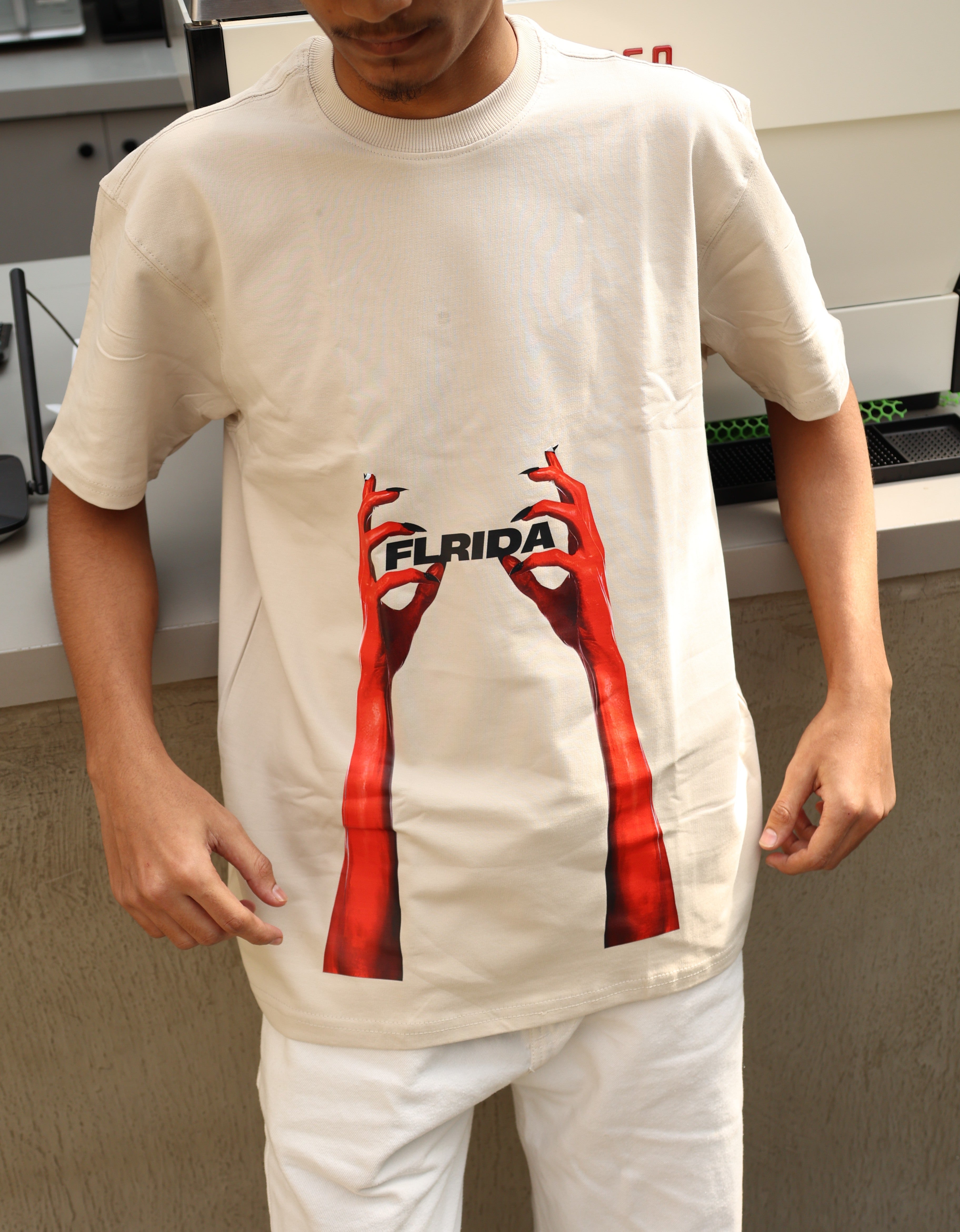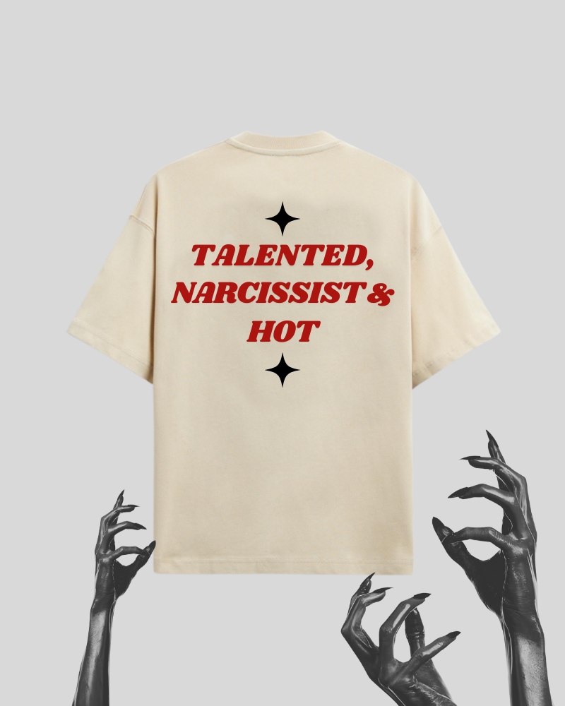 A tee made for people who walk into a room and instantly shift the energy. The front artwork pairs striking red-painted hands with the FLRIDA logo — sharp, elegant, and impossible to ignore. Flip it around and the back says exactly what everyone else is thinking: “Talented, narcissist & hot.”