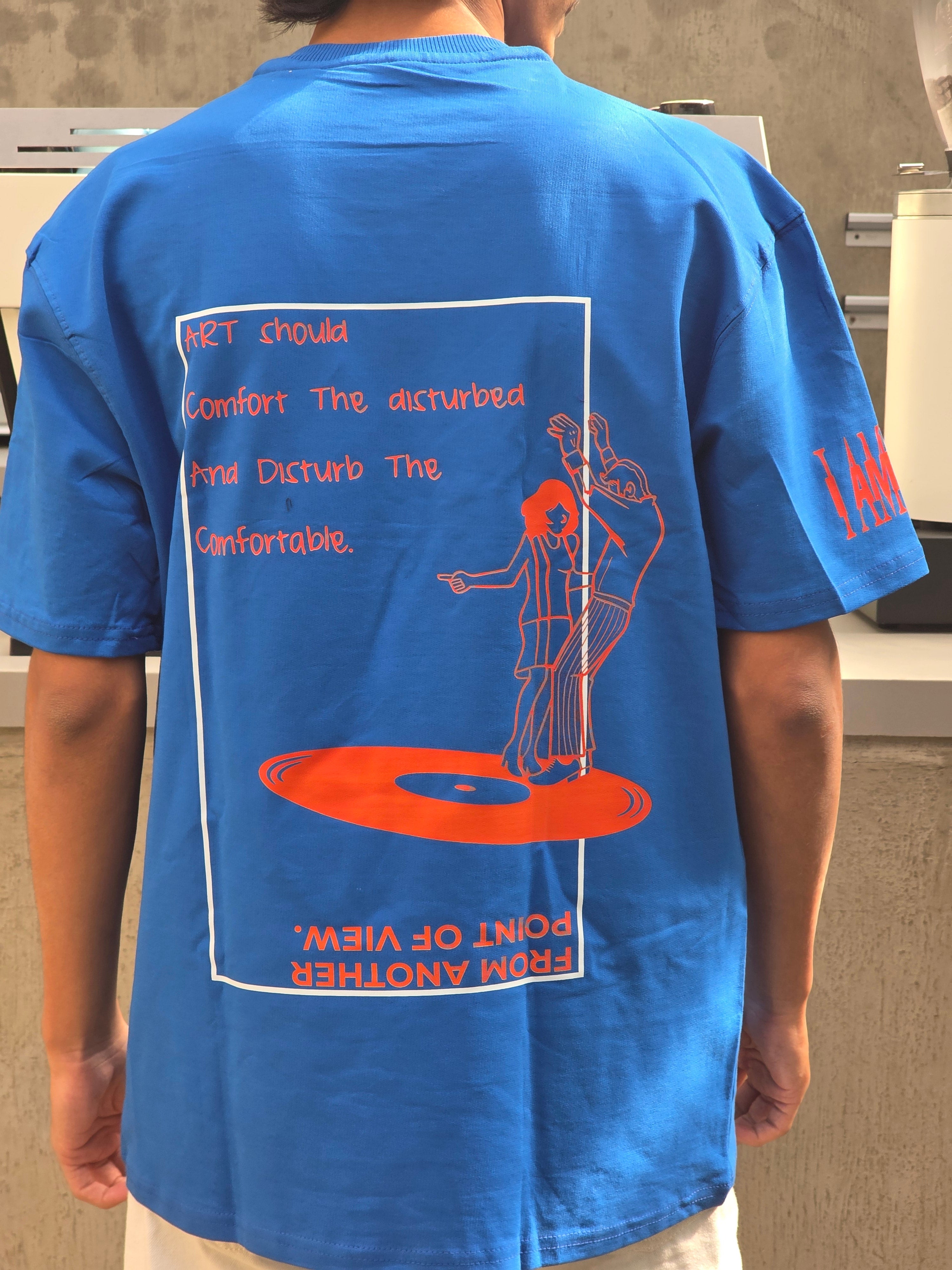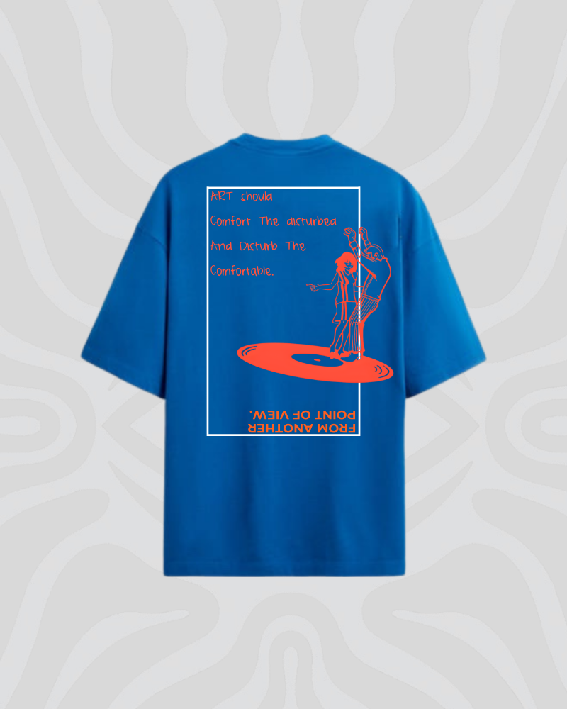A tee made for artists who don’t ask for permission. The front keeps it subtle with the statement “The artist is a holy rebel” — a quiet warning stitched into everyday wear. Turn it around and the back becomes the manifesto: “Art should comfort the disturbed and disturb the comfortable.” Paired with raw, expressive artwork, this piece stands at the intersection of chaos and clarity.