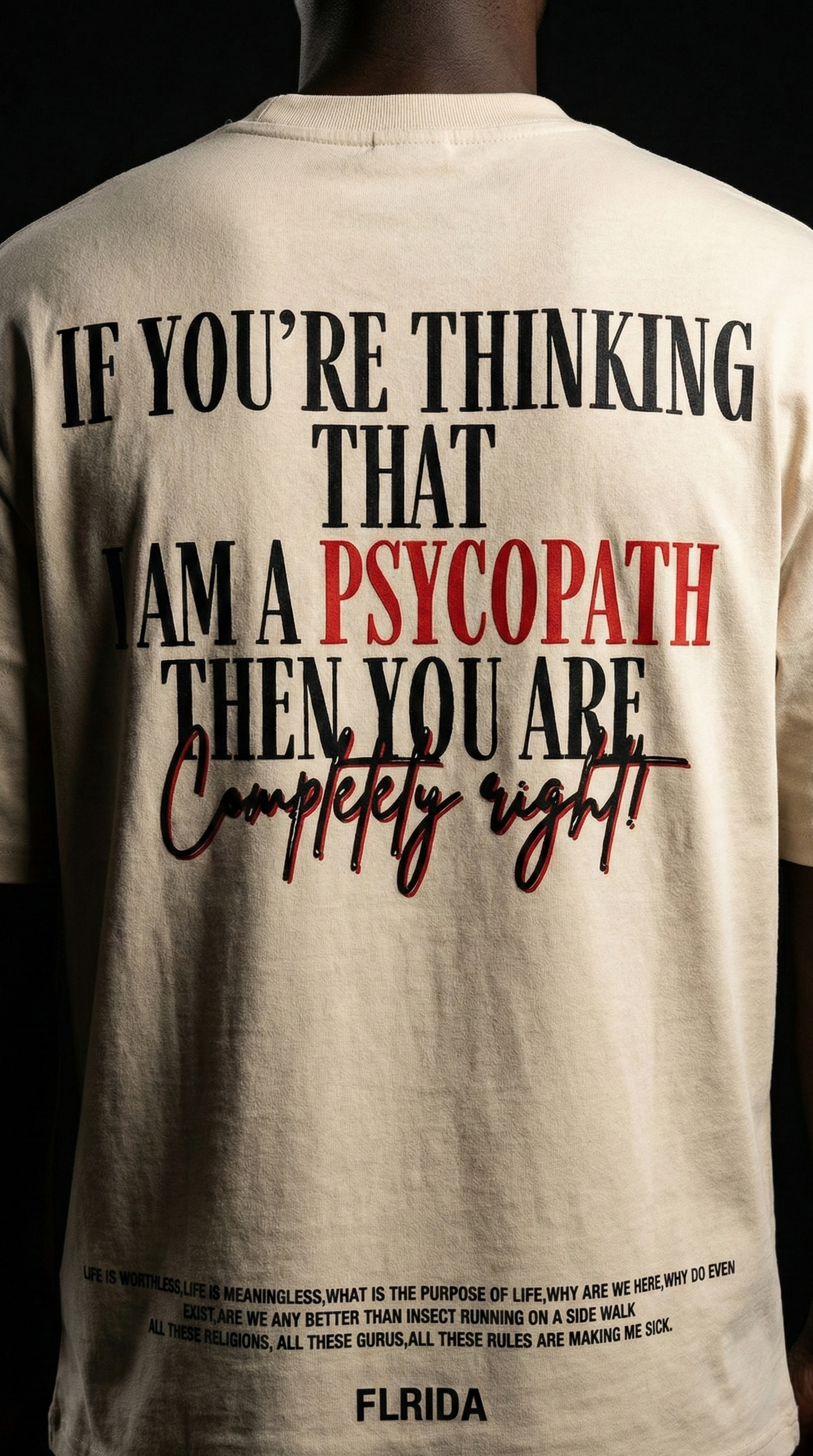 A tee made for people who aren’t afraid of labels — in fact, they wear them louder than anyone else. The back hits first with the brutal line: “If you’re thinking that I am a psychopath, then you are completely right.” Big, unapologetic, and impossible to ignore. The front balances it with a shadowy crowd graphic and the cold message — “Come, go, take nothing.”